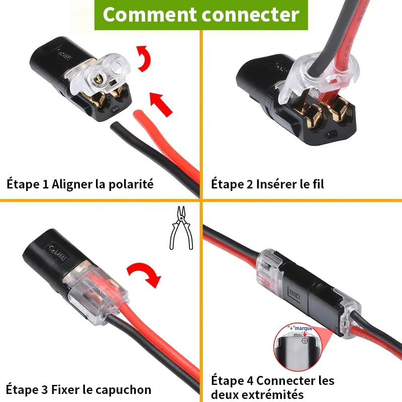[Applications polyvalentes] Ces connecteurs de câble sont idéaux pour une installation dans les véhicules, les équipements audio et vidéo, les haut-parleurs, les rubans LED et autres appareils électriques. Ils sont couramment utilisés dans les habitations pour diverses connexions CC basse tension avec des pertes minimales. Les connecteurs à 2 broches pour rubans LED permettent d'améliorer votre productivité, de gagner du temps et de réaliser des économies d'énergie.