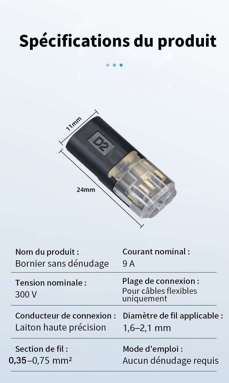 - Mode d’installation : installation sans dénudage des fils
