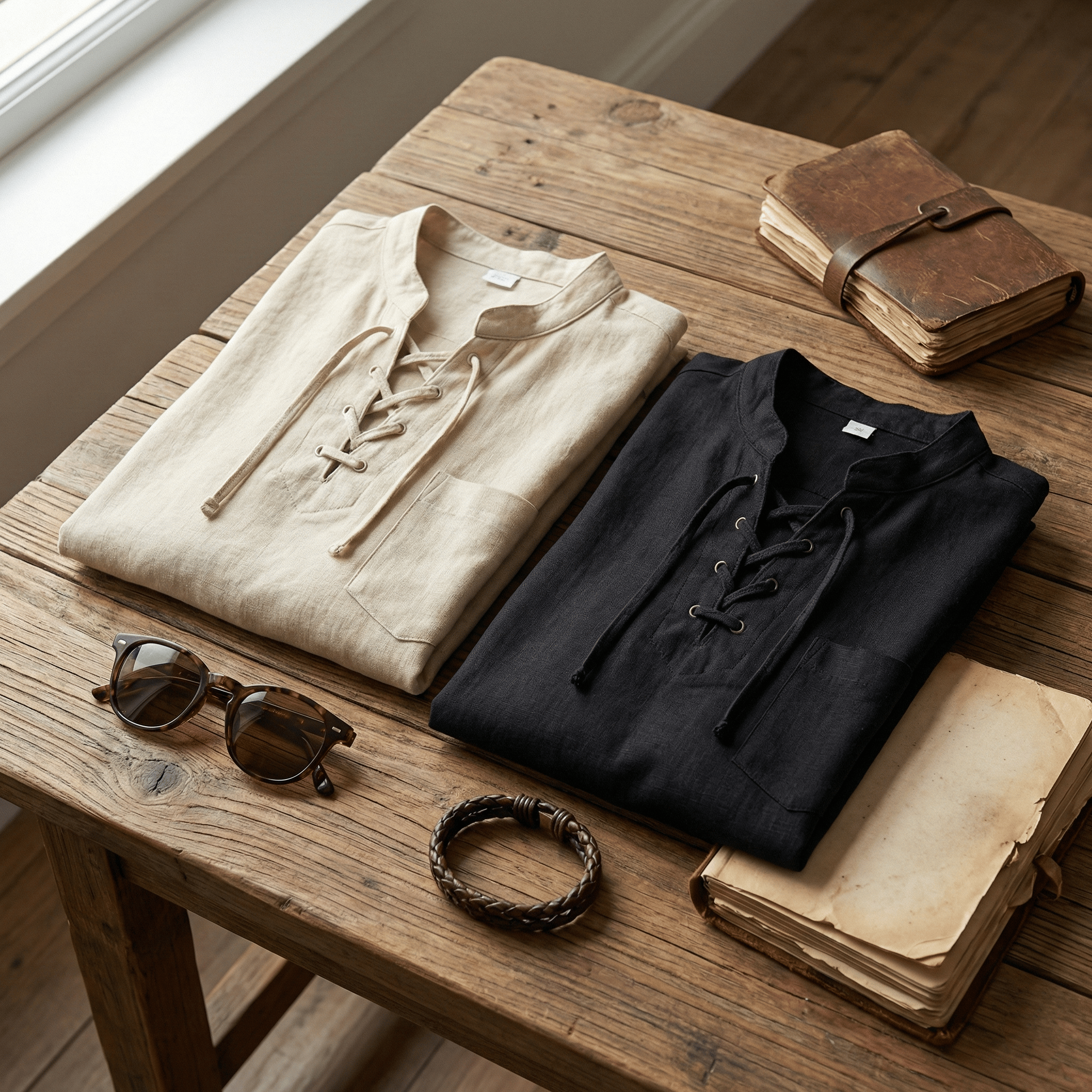 Week-end décontracté : Associez la chemise Beige Naturel à un jean délavé clair, des baskets blanches et un bracelet tissé pour un look détendu, inspiré des côtes.