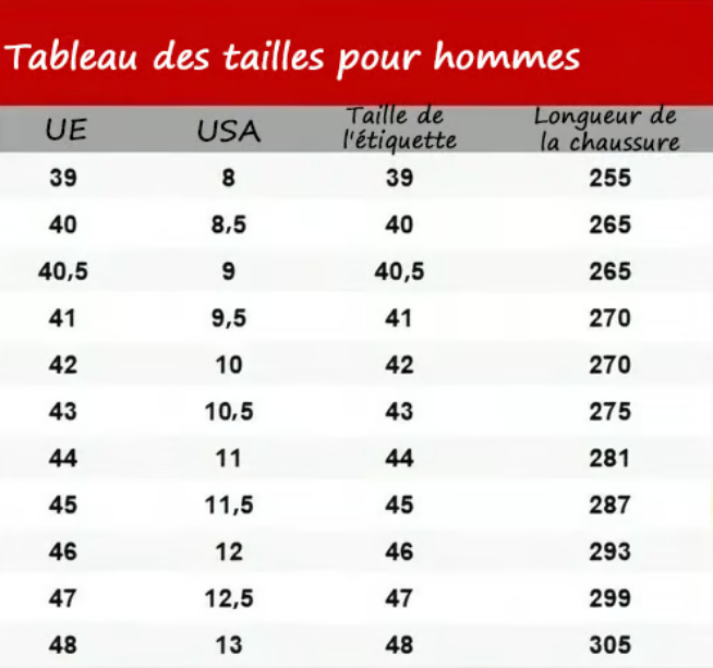 Conseils : veuillez choisir la pointure en fonction de la longueur de la chaussure.